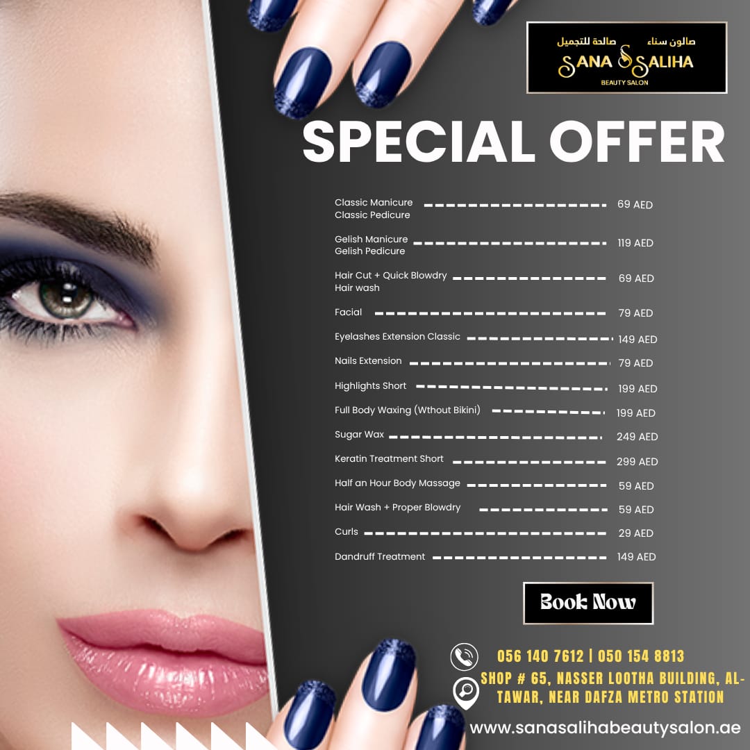 Sana Saliha Beauty Salon is the most precious salon in Dubai. We are basically providing a ladies’ salon-based broad range of beauty services.