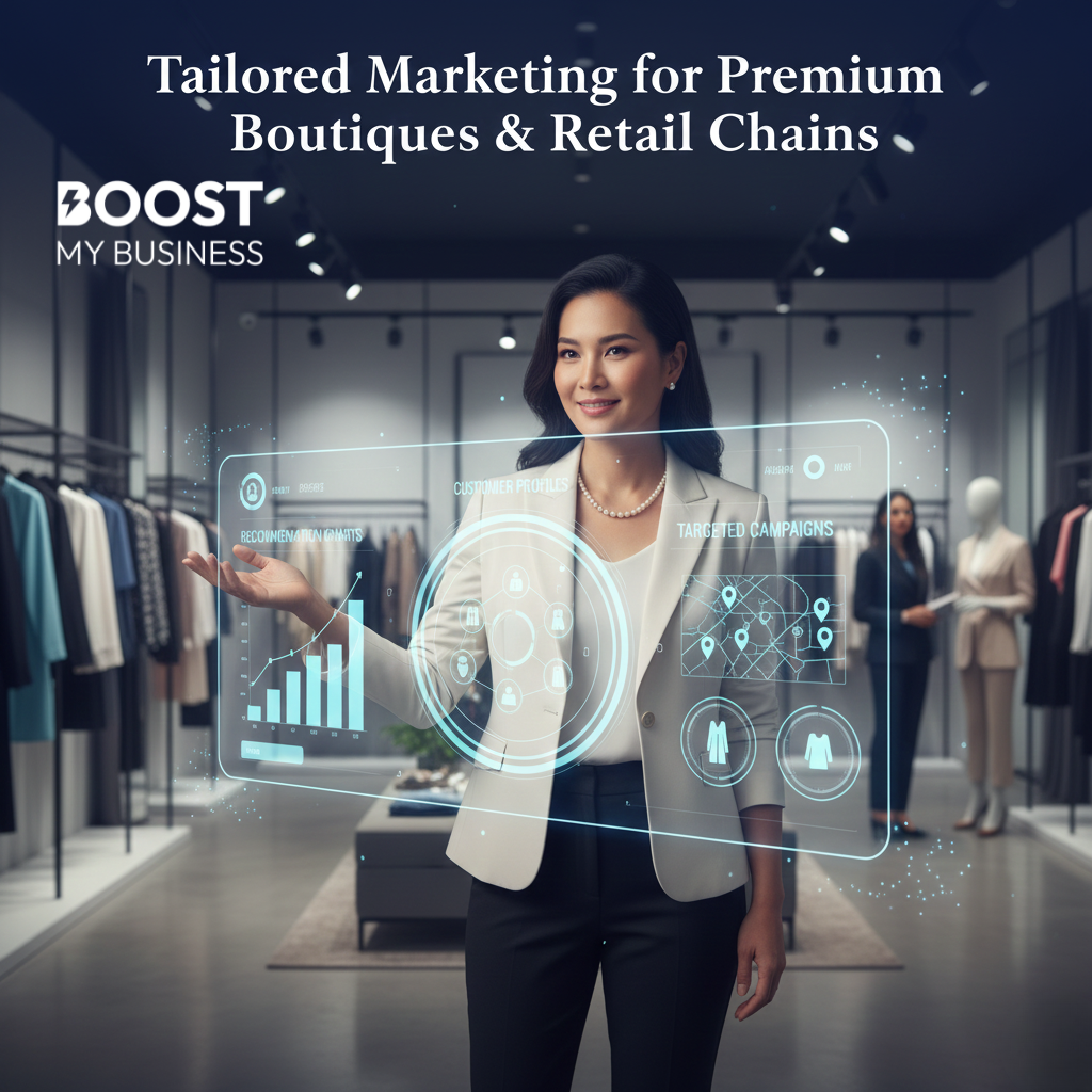 Dubai Luxury Retail Marketing – By Boost My Business is an AI-driven marketing agency in Dubai specializing in luxury retail, jewelry, fashion, and designer boutiques. We help premium brands, showrooms, and retailers increase walk-ins, sales, and brand visibility through Google Ads, Meta Ads, influencer marketing, SEO, and automation. Our AI-powered strategies attract high-net-worth buyers, tourists, and affluent shoppers searching for luxury shopping, jewelry stores, and fashion brands in Dubai, UAE, driving consistent foot traffic, qualified leads, and revenue growth for your luxury business. Our AI-powered strategies attract high-net-worth buyers, tourists, and affluent shoppers searching for luxury shopping, jewelry stores, and fashion