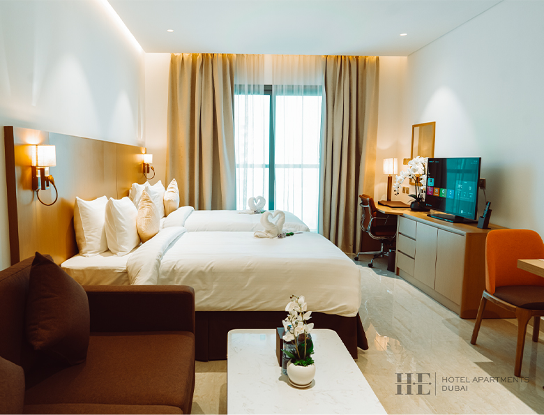 At HE Hotel, we blend comfort with convenience. Whether you’re here for business or leisure, we’ve got you covered, from our 24/7 front desk and concierge service to our fitness center, rooftop lounge, and luxury spa. At HE Hotel, we offer more than just a room, we deliver full experiences across our collection of refined hotels and residences. Our hotel and apartments blend world-class service with the charm of its local surroundings. Our mission is simple: create spaces where guests feel both indulged and at home. HE Hotel offers modern comfort in the heart of Jumeirah Village Circle (JVC), Dubai. Guests enjoy quick access to Dubai Marina (18 min), Business Bay (16 min), and Downtown Dubai (20 min), making it ideal for business and leisure stays.